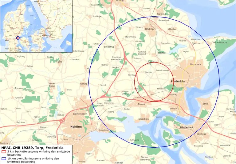 Som følge af udbruddet har Fødevarestyrelsen oprettet en beskyttelseszone på tre kilometer og en overvågningszone på ti kilometer omkring ejendommen.