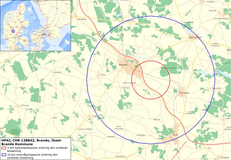 Prøver fra Statens Serum Institut viser, at en hønsebesætning lidt uden for Brande er ramt af fugleinfluenza. Besætningen består af 60.000 høns. Hønsene aflives tirsdag i samarbejde med Beredskabsstyrelsen. Aflivningen sker for at forebygge smittespredning.