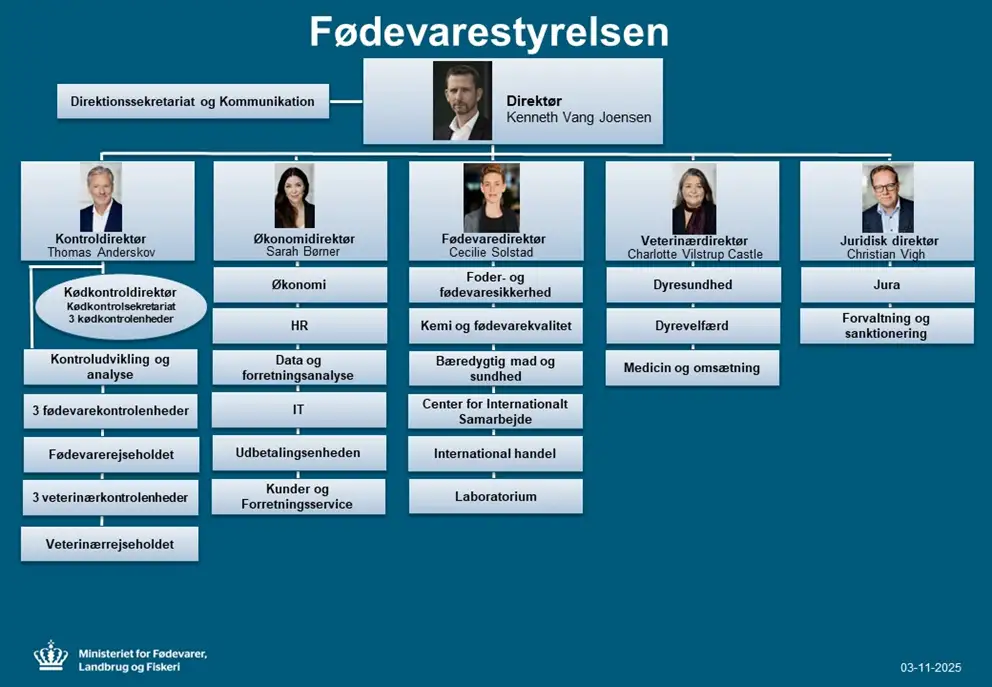 Fødevarestyrelsen består af fem faglige forretningsområder: Kødkontrol, Økonomi, Veterinær, Fødevarer, samt Innovation- og Udvikling.