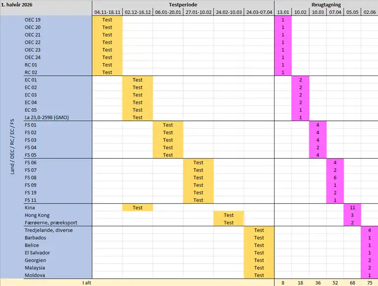 Fra februar 2025 indføres en ny proces for udrulning af certifikater i DIX, hvilket betyder, at erhvervet tilbydes en to-ugers periode til at teste og kommentere på de oprettede certifikatmodeller, inden de endelige udgaver sendes til de pågældende tredjelandes myndigheder. Certifikatmodellerne til test kan findes via funktionen 'Vis preview modeller' i DIX produktionsmiljø. De fastsatte test-perioder er angivet herunder.